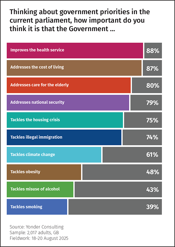 Similarly, in relation to the National Health Service, 88% believe the most important priorities are addressing ambulance response times, and improving waiting times for treatment. Fewer than half (42%) think that ‘tackling smoking’ is important.