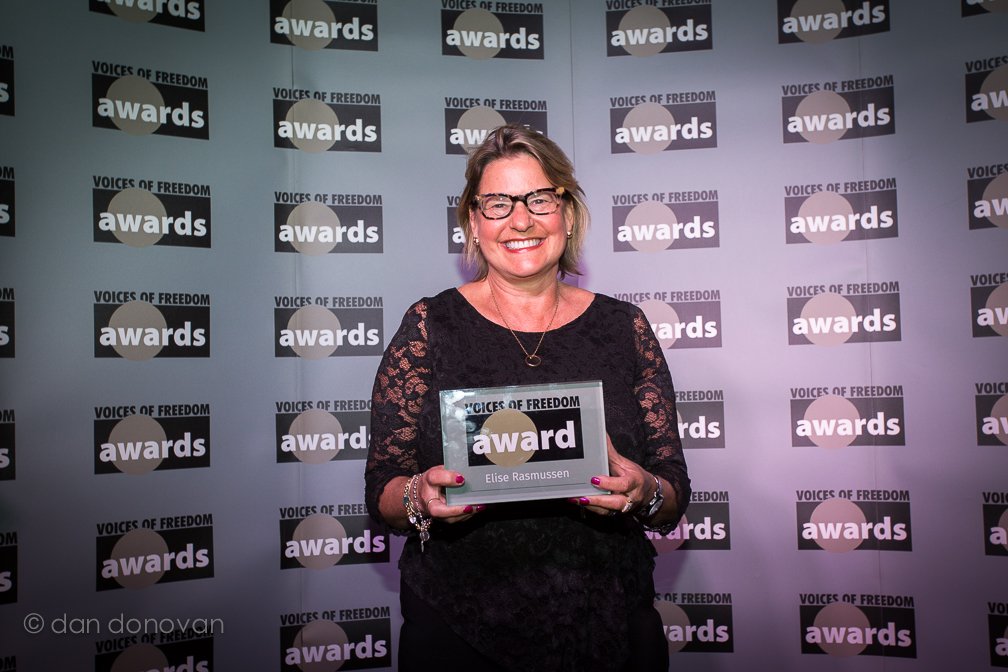 Below: Elise Rasmussen receiving her ‘Voices of Freedom’ award at the Forest Freedom Dinner in 2017